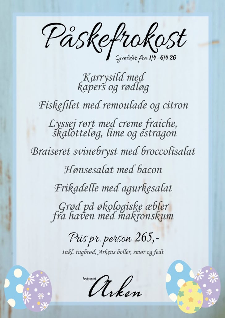 Påskefrokost på Restaurant Arken serveres fra onsdag d. 1/4 til mandag d. 6/4 2026